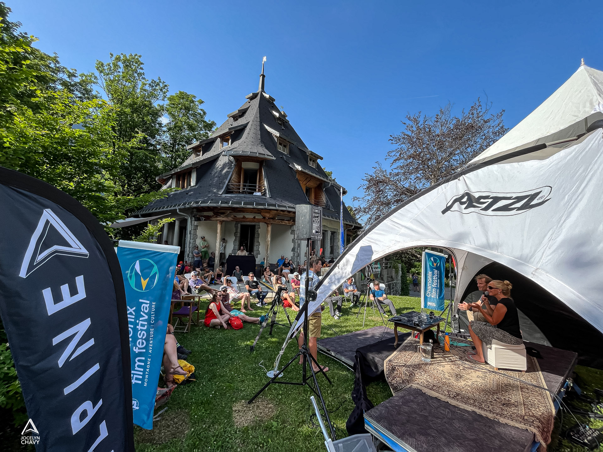 Il est 15 heures ce vendredi 17 juin et Chamonix ne fait pas exception à la canicule qui assomme la France. Comme chaque jour, les membres du jury du Chamonix Film Festival s’installent pour délibérer. Pour ce moment important, qui les amènera à décerner cinq prix à la fin de la semaine, ils ont choisi le luxe : celui de la fraîcheur. Dans les jardins de l’hôtel 5 étoiles du Mont-Blanc, l’ombre se dispute au calme. Pendant ce temps, à quelques centaines de mètres, la Maison des Artistes est en ébullition quelques minutes avant le début des conférences qui vont rythmer l’après-midi. La chaleur a contraint l’organisation du festival à rapatrier les table-rondes à l’intérieur, où l’ambiance feutrée et la climatisation silencieuse brouillent instantanément les repères des spectateurs chamoniards. Sur scène, Jean-Franck Charlet ouvre le bal…