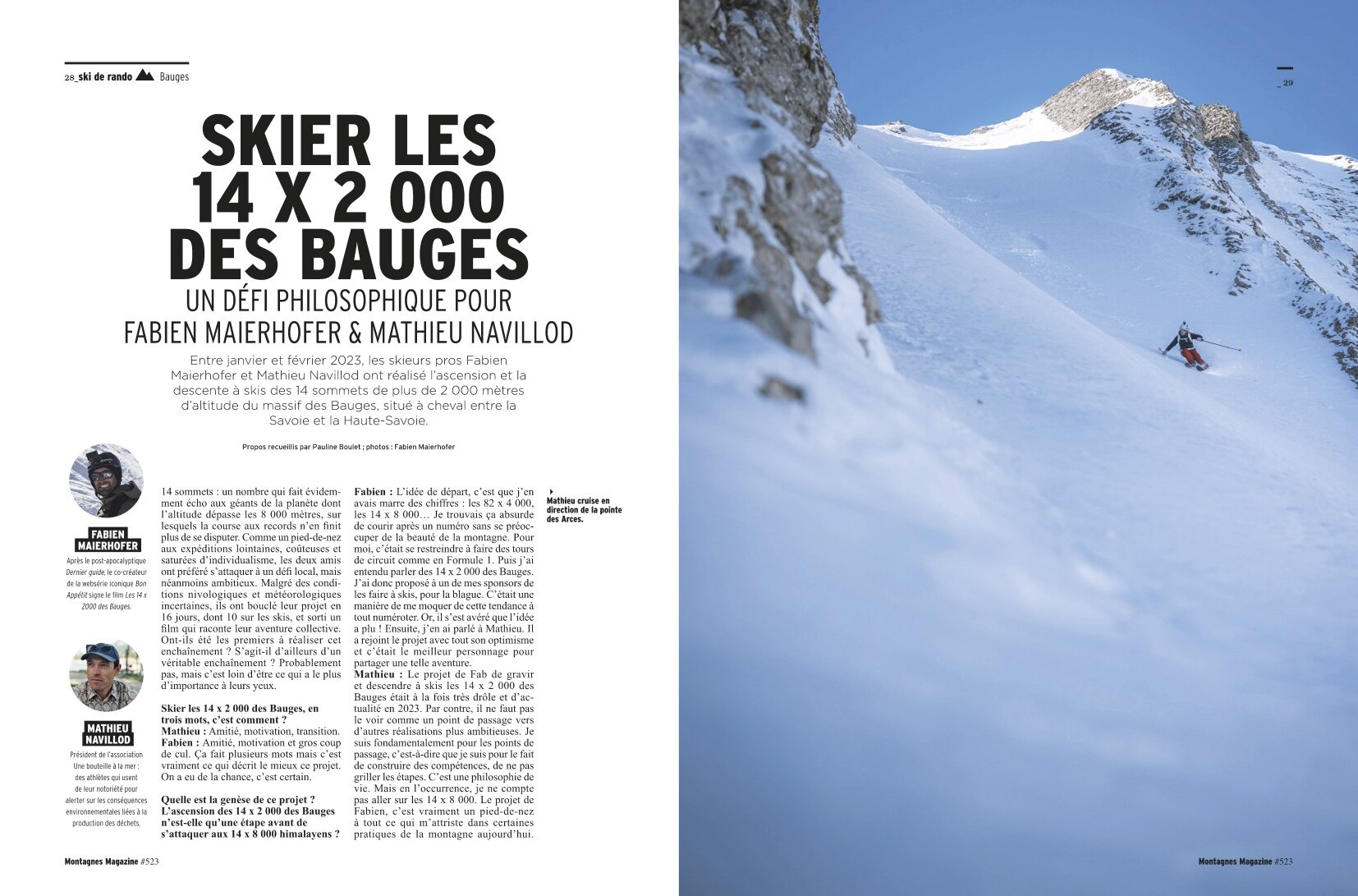 Entre janvier et février 2023, les pro-skieurs Fabien Maierhofer et Mathieu Navillod ont réalisé l’ascension et la descente à ski des 14 sommets de plus de 2000 mètres d’altitude du massif des Bauges, situé à cheval entre la Savoie et la Haute-Savoie. 14 sommets : un nombre qui fait évidemment écho aux géants de la planète dont l’altitude dépasse les 8000 mètres, sur lesquels la course aux records n’en finit plus de se disputer. Comme un pied-de-nez aux expéditions lointaines, coûteuses et saturées d’individualisme, les deux amis ont préféré s’attaquer à un défi local, mais néanmoins ambitieux. Malgré des conditions nivologiques et météorologiques incertaines, ils ont bouclé leur projet en 16 jours, dont 10 sur les skis, et sorti un film qui raconte leur aventure collective. Ont-ils été les premiers à réaliser cet enchaînement ? S’agit-il d’ailleurs d’un véritable enchaînement ? Probablement pas, mais c’est loin d’être ce qui a le plus d’importance à leurs yeux. Entretien croisé.